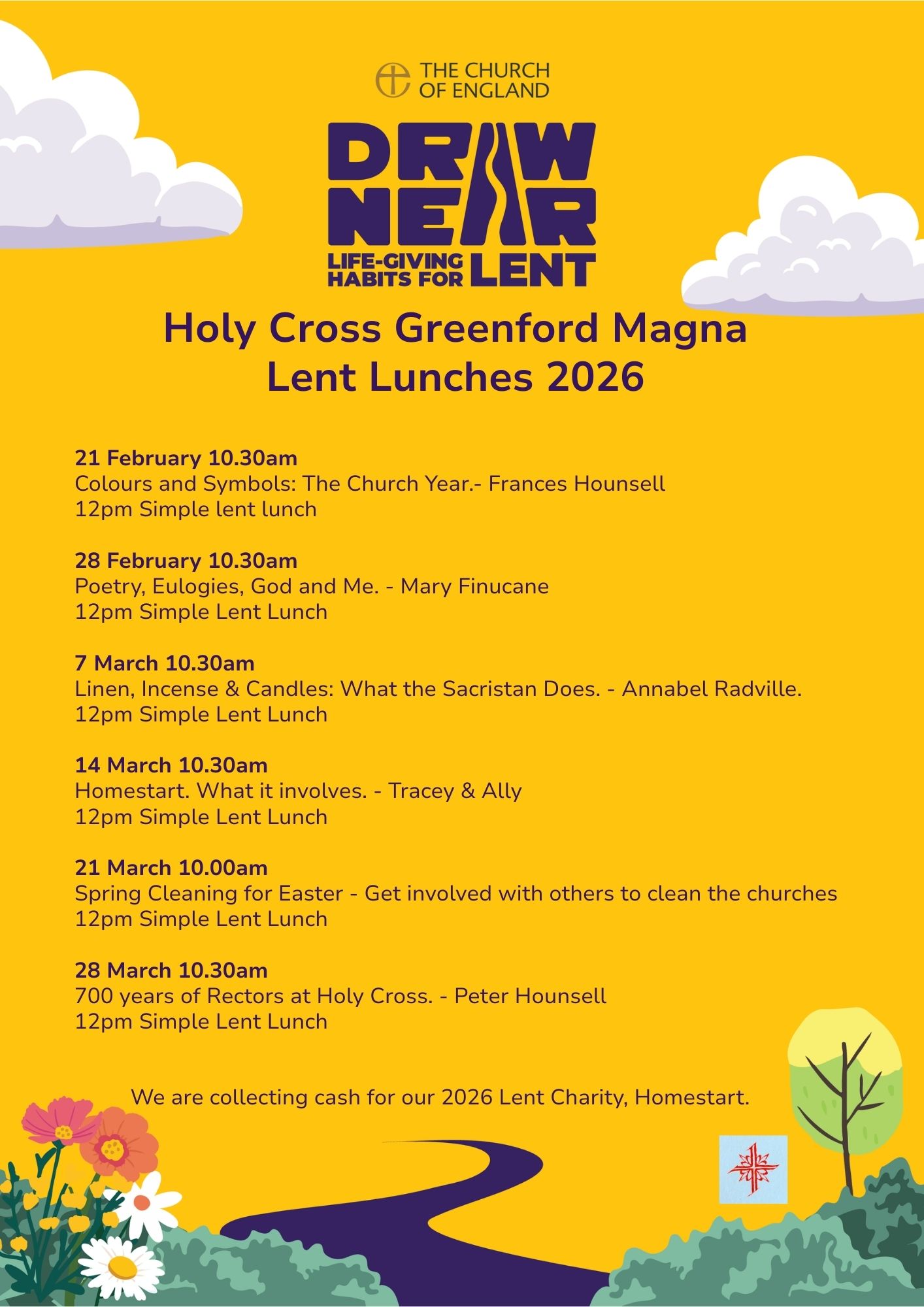 Saturday 21 February 10.30am. Lent Lunch and talk. Talk on Colours & Symbols: The Church Year by Frances Hounsell. Lunch served at 12 noon. Cash collection on behalf of Home-Start Ealing